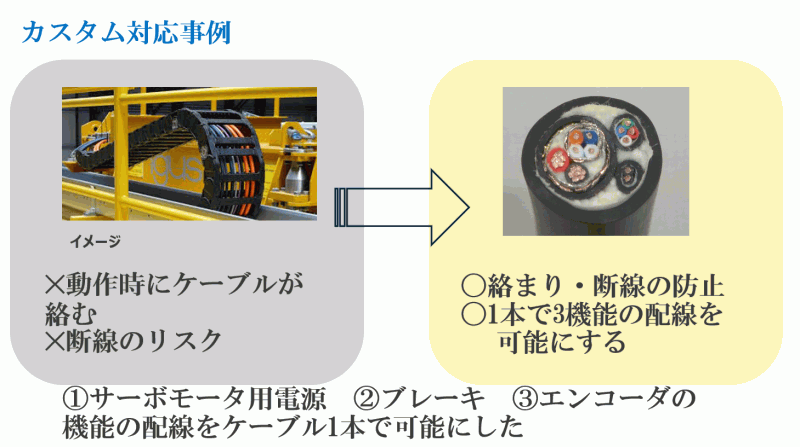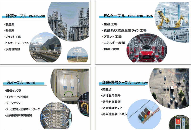 また、食品や自動車といった製造現場のロボットにも配線されるケーブルも扱っており、日本の生産活動を支える製品となっています。