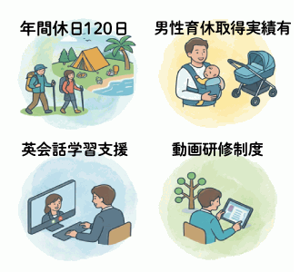 また、英会話学習や資格取得への支援、動画研修制度も充実しており、社員一人ひとりの成長をサポートする体制も整えています。
