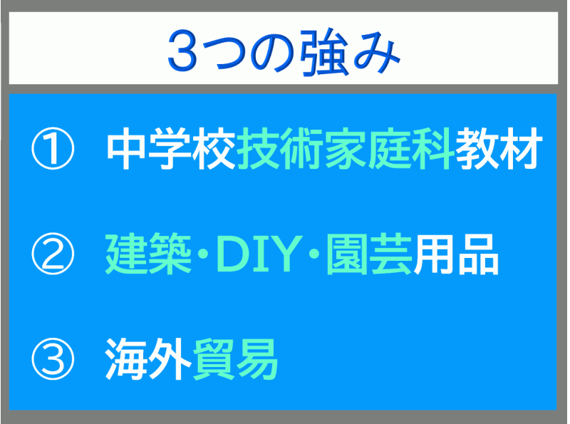 中学校「技術・家庭科」の教材教具や設備品を北海道から沖縄までの代理店網を通じて全国展開しています。全国10,000校余の中学校及び高校、大学の現場の先生方に信頼され、お手伝いできる“トップマン”として自覚と責任を持って取組んでいます。